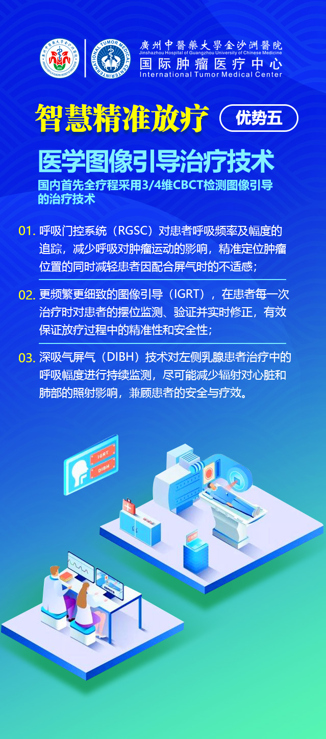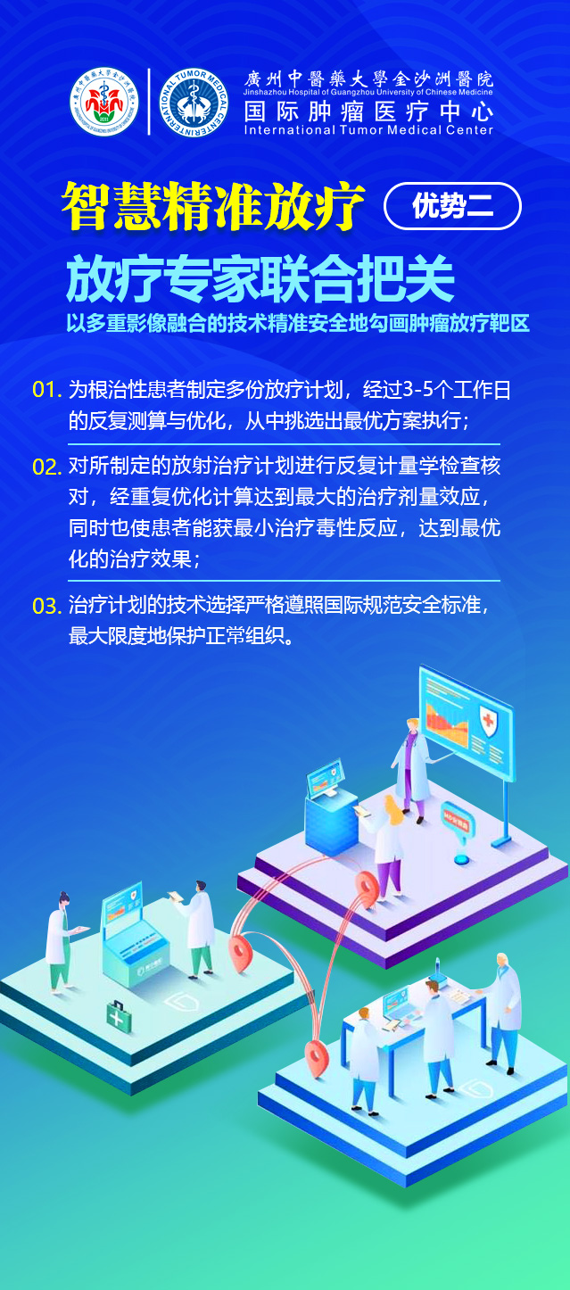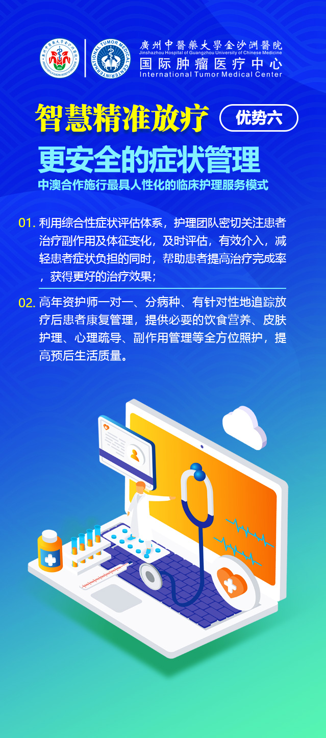 广州中医药大学金沙洲医院国际肿瘤医疗中心是按照国内三甲肿瘤专科医院标准以及国际顶尖医疗机构标准建设的现代化癌症中心。为了让患者不出国门就能享受规范化、高品质的放疗服务,中心配备高端的医学影像诊断与放射治疗设备,并采用国际先进的多学科肿瘤诊疗方法(MDT)和规范化的全病程管理,努力打造国内领先,国际一流的肿瘤国际化诊疗服务平台,为广大肿瘤患者提供世界领先的高品质医疗服务。